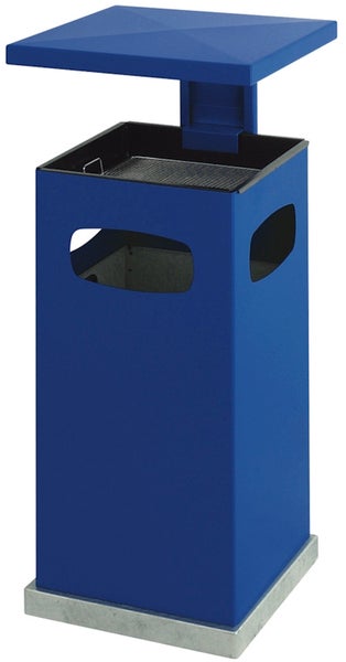 Metall Ascher-Papierkorb mit abnehmbarem Dach und drei Einwurfmöglichkeiten. Ausgestattet mit Inneneimer aus Metall, schwarzer Einsatz und verchromten Sieb. Inklusive Befestigungsmaterial für Bodenmontage.