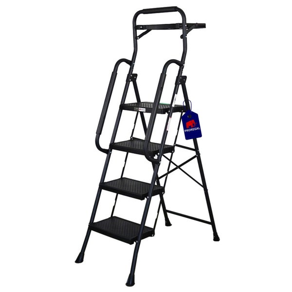PROREGAL Profi-Trittleiter klappbar mit Handbügel und Werkzeugablage 4 Stufen 160x51x87cm Traglast 150kg Stahl Schwarz Klappleiter Haushaltsleiter