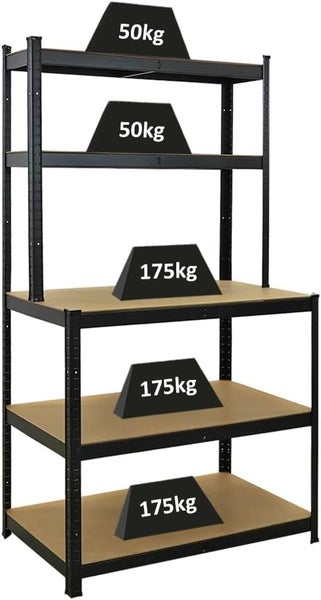 Die Werkbank verfügt über 5 Fachböden aus hochwertigem MDF-Platten mit einer Bodenstärke von 5 mm, die dank des Höhenrasters in 2,5 cm Abständen höhenverstellbar sind. Die 3 unteren Ebenen mit einer Tiefe von jeweils 60 cm bieten großzügigen Stauraum für schwere Werkzeuge oder Materialien. Die beiden oberen Ebenen mit einer Tiefe von jeweils 30 cm sind ideal für kleinere Werkzeuge oder als zusätzliche Ablageflächen. Mithilfe von jeweils 1 Unterstrebe bietet die Werkbank eine Traglast von 175 kg für die unteren Fachböden und 50 kg für die oberen Fachböden.