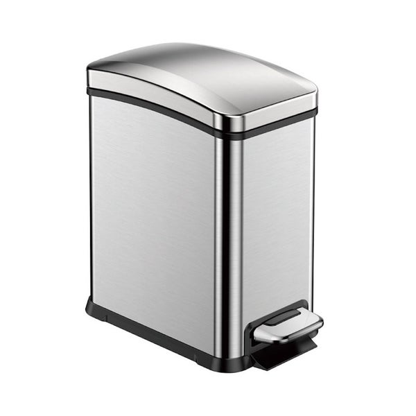 Rechteckiger Treteimer aus gebürstetem Edelstahl mit fingerabdruckfester Beschichtung, geräuschlos Schließendem Deckel und Kunststoffinneneimer. Passt dank des schlanken Designs und dem Pedal an der kurzen Seite perfekt in kleine Räume. Mit Handgriff an der Rückseite.