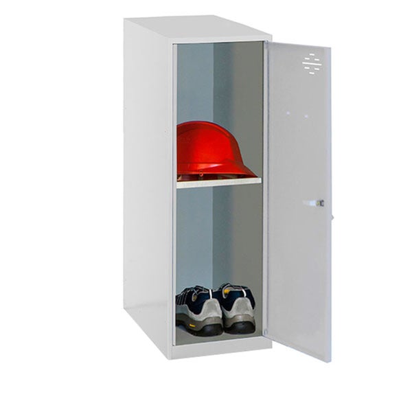Der Schließfachschrank AMEGO von PROREGAL ist 91,5 cm (ohne Standfüße) und 101,5 cm (mit Standfüße) hoch und walhweise in 30 cm oder 40 cm Breite verfügbar. Der Schrank hat ein Schloss mit Schlüssel und ist bestens als Umkleideschrank geeignet.