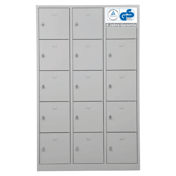 Der Schließfachschrank ist hervorragend für Umkleiden, Sozialräume oder Empfangsbereiche in Firmen oder Behörden geeignet. Die pulverbeschichtete Konstruktion ist leicht in der Reinigung und zugleich widerstandsfähig und langlebig.