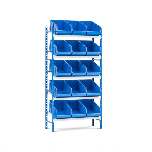 PROREGAL Schrägbodenregal MAXIMUS mit 15x Sichtlagerboxen à 31,5L Fachlast 130kg Grundregal HxBxT 200x100x40cm 5 Ebenen Lichtblau/Lichtgrau