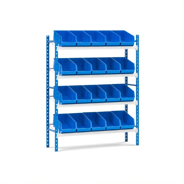 PROREGAL Schrägbodenregal MAXIMUS mit 20x Sichtlagerboxen à 15,3L Fachlast 130kg Grundregal HxBxT 160x125x40cm 4 Ebenen Lichtblau/Lichtgrau