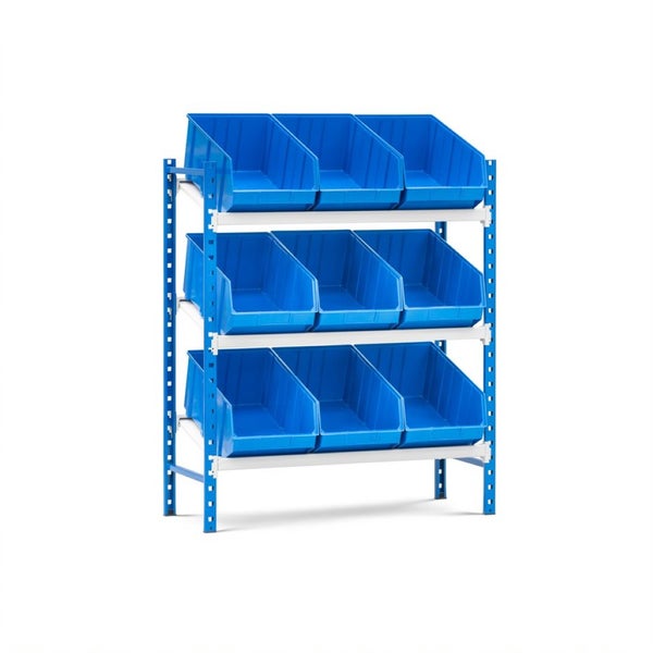 PROREGAL Schrägbodenregal MAXIMUS mit 9x Sichtlagerboxen à 31,5L Fachlast 130kg Grundregal HxBxT 120x100x40cm 3 Ebenen Lichtblau/Lichtgrau