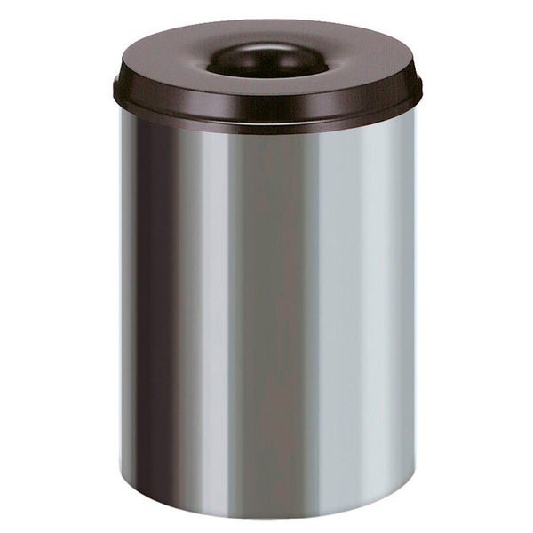 Runder und PROREGAL Selbstlöschender Papierkorb aus Edelstahl. Komplett Einfarbig oder mit schwarzem Deckel. Sollte im Papierkorb Feuer entstehen, werden die aufsteigenden Verbrennungsgase durch den Löschkopf zurückgedrängt und stauen sich unter der Einwurföffnung. Dadurch wird die Sauerstoffzufuhr gestoppt und das Feuer erstickt.