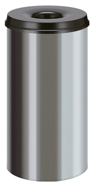 Runder und PROREGAL Selbstlöschender Papierkorb aus Edelstahl. Komplett Einfarbig oder mit schwarzem Deckel. Sollte im Papierkorb Feuer entstehen, werden die aufsteigenden Verbrennungsgase durch den Löschkopf zurückgedrängt und stauen sich unter der Einwurföffnung. Dadurch wird die Sauerstoffzufuhr gestoppt und das Feuer erstickt.