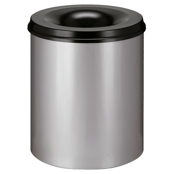Runder und PROREGAL Selbstlöschender Papierkorb aus Metall. Komplett Einfarbig oder mit farbigem Korpus und schwarzem Deckel. Sollte im Papierkorb Feuer entstehen, werden die aufsteigenden Verbrennungsgase durch den Löschkopf zurückgedrängt und stauen sich unter der Einwurföffnung. Dadurch wird die Sauerstoffzufuhr gestoppt und das Feuer erstickt.