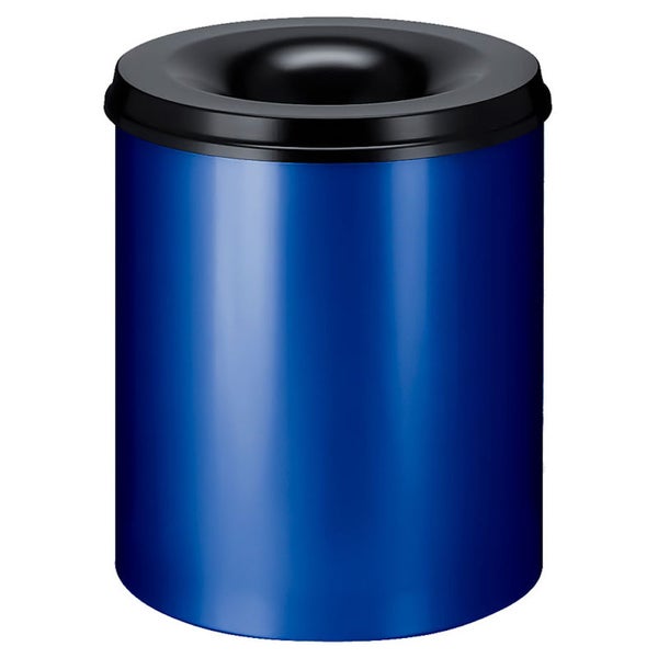 Runder und PROREGAL Selbstlöschender Papierkorb aus Metall. Komplett Einfarbig oder mit farbigem Korpus und schwarzem Deckel. Sollte im Papierkorb Feuer entstehen, werden die aufsteigenden Verbrennungsgase durch den Löschkopf zurückgedrängt und stauen sich unter der Einwurföffnung. Dadurch wird die Sauerstoffzufuhr gestoppt und das Feuer erstickt.