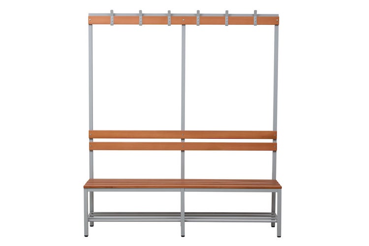 - HinweisDie freistehende Sitzbank ist einseitig mit einer Rückenlehne und einer Hakenleiste ausgestattet