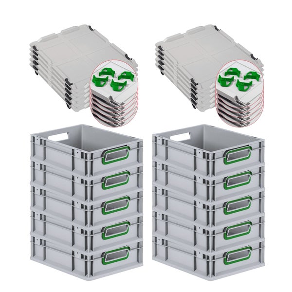 PROREGAL Spar Set 10x Eurobox Nextgen Color Mit Auflagedeckel & Schiebeschnappverschlüsse HxBxT 12 x 30 x 40 cm Griffe Grün Offen Glatter Boden