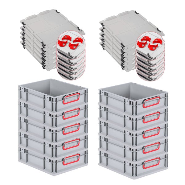 PROREGAL Spar Set 10x Eurobox Nextgen Color Mit Auflagedeckel & Schiebeschnappverschlüsse HxBxT 12 x 30 x 40 cm Griffe Rot Geschlossen Glatter Boden
