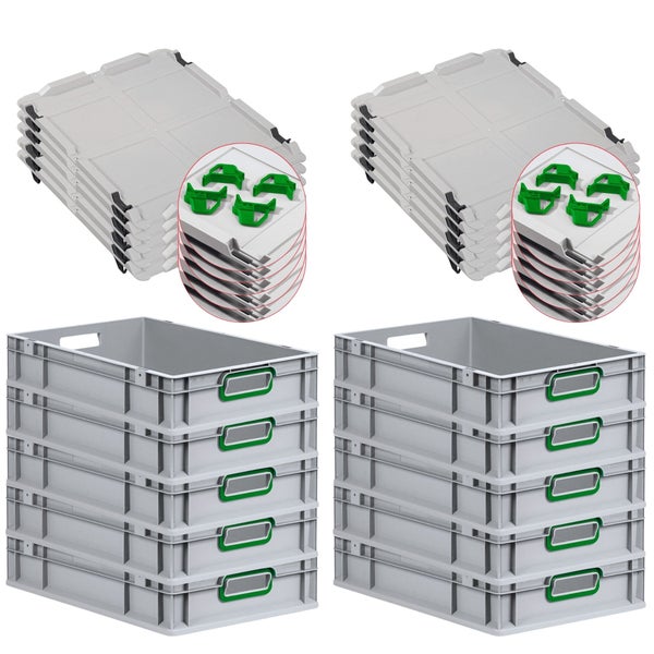 PROREGAL Spar Set 10x Eurobox Nextgen Color Mit Auflagedeckel & Schiebeschnappverschlüsse HxBxT 12 x 40 x 60 cm Griffe Grün Offen Glatter Boden
