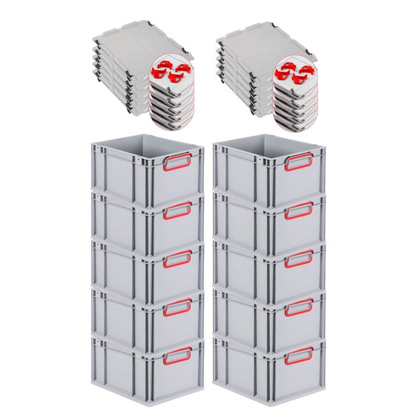PROREGAL Spar Set 10x Eurobox Nextgen Color Mit Auflagedeckel & Schiebeschnappverschlüsse HxBxT 22 x 30 x 40 cm Griffe Rot Geschlossen Glatter Boden