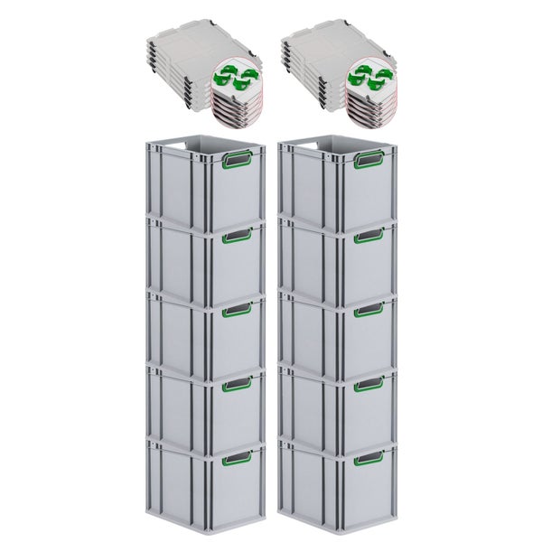 PROREGAL Spar Set 10x Eurobox Nextgen Color Mit Auflagedeckel & Schiebeschnappverschlüsse HxBxT 32 x 30 x 40 cm Griffe Grün Offen Glatter Boden