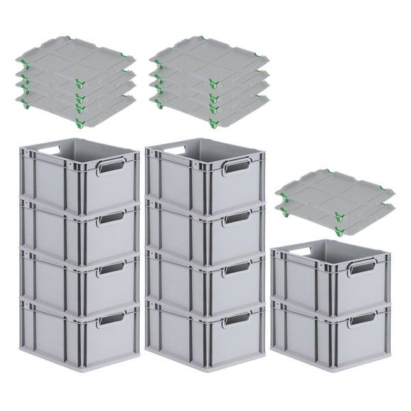 PROREGAL Spar Set 10x Eurobox Nextgen Economy Mit Auflagedeckel & 4x Schiebeschnappverschlüsse Grün Griffe Offen HxBxT 22 x 30 x 40 cm 20 Liter