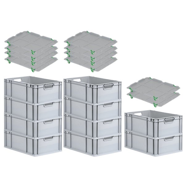 PROREGAL Spar Set 10x Eurobox Nextgen Economy Mit Auflagedeckel & 4x Schiebeschnappverschlüsse Grün Griffe Offen HxBxT 22 x 40 x 60 cm 44 Liter