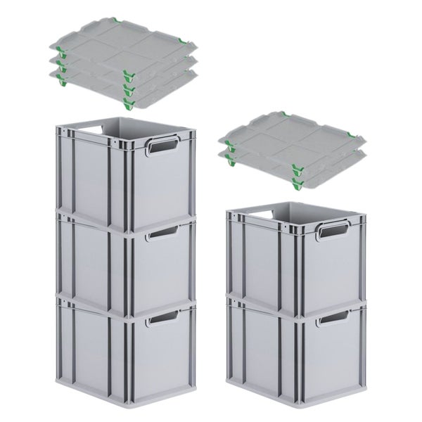 PROREGAL Spar Set 5x Eurobox Nextgen Economy Mit Auflagedeckel & 4x Schiebeschnappverschlüsse Grün Griffe Offen HxBxT 32 x 30 x 40 cm 30 Liter