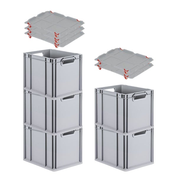 PROREGAL Spar Set 5x Eurobox Nextgen Economy Mit Auflagedeckel & 4x Schiebeschnappverschlüsse Rot Griffe Offen HxBxT 32 x 30 x 40 cm 30 Liter