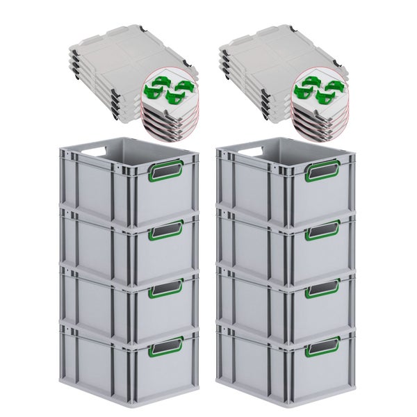 PROREGAL Spar Set 8x Eurobox Nextgen Color Mit Auflagedeckel & Schiebeschnappverschlüsse HxBxT 22 x 30 x 40 cm Griffe Grün Offen Glatter Boden