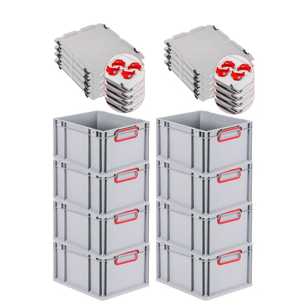 PROREGAL Spar Set 8x Eurobox Nextgen Color Mit Auflagedeckel & Schiebeschnappverschlüsse HxBxT 22 x 30 x 40 cm Griffe Rot Geschlossen Glatter Boden