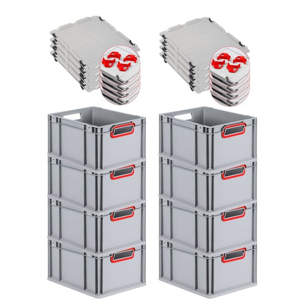 PROREGAL Spar Set 8x Eurobox Nextgen Color Mit Auflagedeckel & Schiebeschnappverschlüsse HxBxT 22 x 30 x 40 cm Griffe Rot Offen Glatter Boden