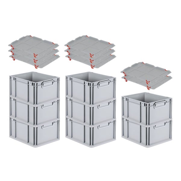 PROREGAL Spar Set 8x Eurobox Nextgen Economy Mit Auflagedeckel & 4x Schiebeschnappverschlüsse Rot Griffe Geschlossen HxBxT 22 x 30 x 40 cm 20 Liter