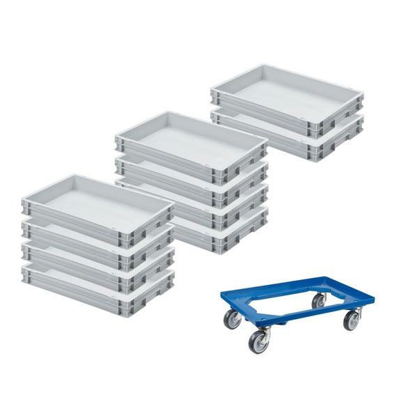 PROREGAL SparSet 10 x Eurobehälter Mit Geschlossenem Griff und 1 x Transportroller Blau HxBxT 7,5 x 40 x 60 cm 15 Liter Eurobox Transportbox