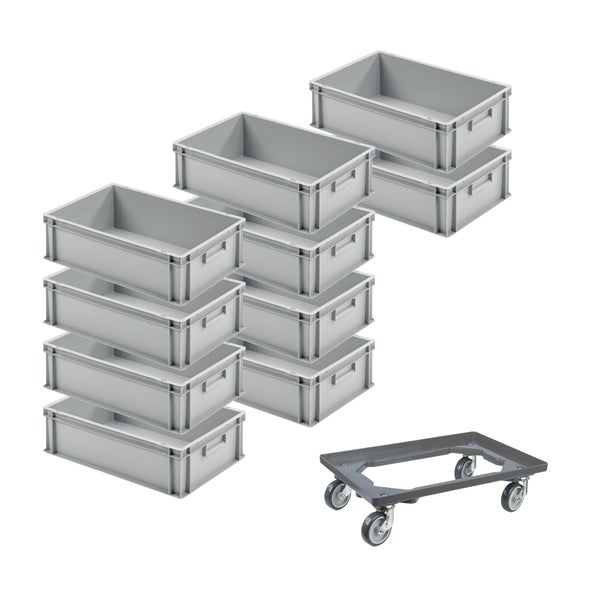PROREGAL SparSet 10 x Eurobehälter Mit Geschlossenem Griff und 1 x Transportroller Grau HxBxT 17,5 x 40 x 60 cm 30 Liter Eurobox Transportbox