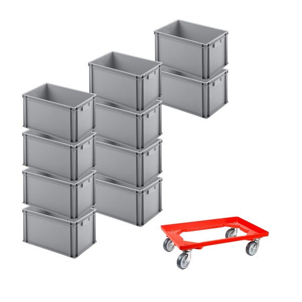 PROREGAL SparSet 10x Eurobehälter mit Geschlossenem Griff und 1 x Transportroller Rot HxBxT 32 x 40 x 60 cm 56 Liter Eurobox Transportbox