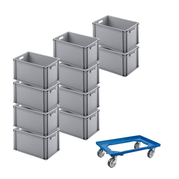 PROREGAL SparSet 10x Eurobehälter mit Offenem Griff und 1 x Transportroller Blau HxBxT 32 x 40 x 60 cm 56 Liter Eurobox Transportbox