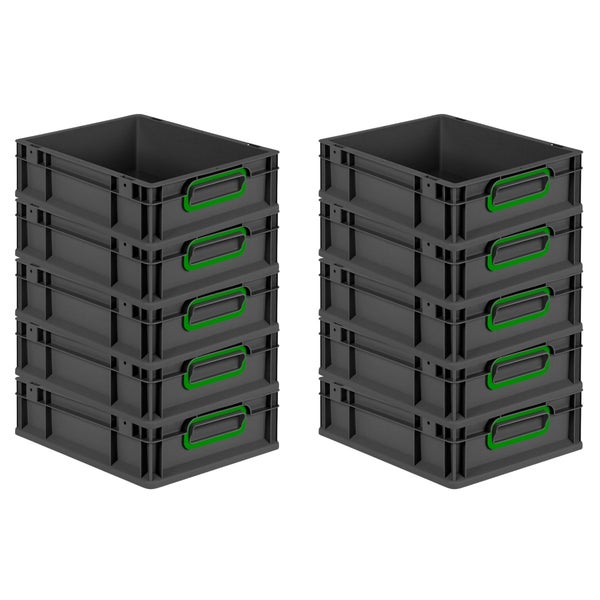 PROREGAL SparSet 10x Eurobox NextGen Color, HxBxT 12x30x40cm, 11 Liter, Griffe grün geschlossen, Schwarz, Eurobehälter, Transportbox, Transportbehälter, Stapelbehälter