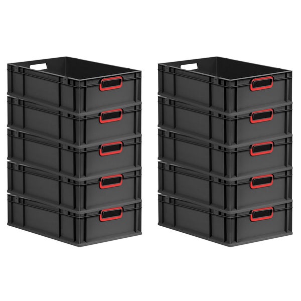 PROREGAL SparSet 10x Eurobox NextGen Color, HxBxT 17x40x60cm, 34 Liter, Griffe rot offen, Schwarz, Eurobehälter, Transportbox, Transportbehälter, Stapelbehälter