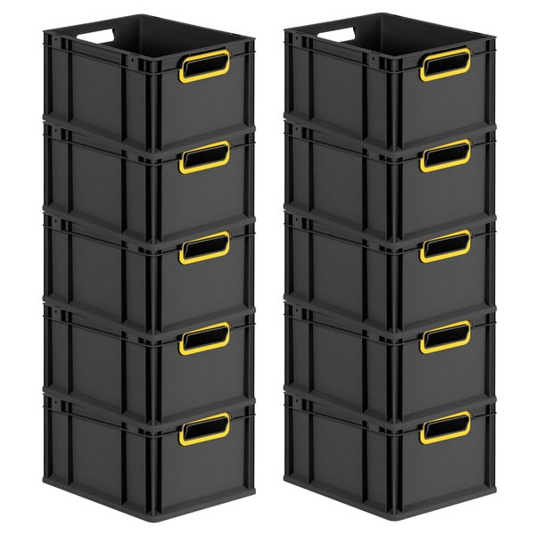 PROREGAL SparSet 10x Eurobox NextGen Color, HxBxT 22x30x40cm, 20 Liter, Griffe gelb offen, Schwarz, Eurobehälter, Transportbox, Transportbehälter, Stapelbehälter
