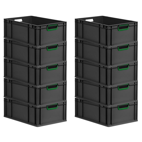 PROREGAL SparSet 10x Eurobox NextGen Color, HxBxT 22x40x60cm, 44 Liter, Griffe grün offen, Verstärkter Boden, Schwarz, Eurobehälter, Transportbox, Transportbehälter, Stapelbehälter