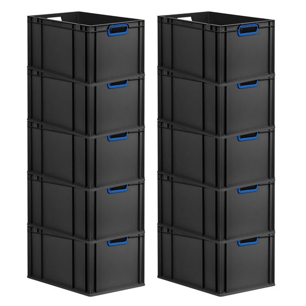 PROREGAL SparSet 10x Eurobox NextGen Color, HxBxT 32x40x60cm, 65 Liter, Griffe blau offen, Verstärkter Boden, Schwarz, Eurobehälter, Transportbox, Transportbehälter, Stapelbehälter