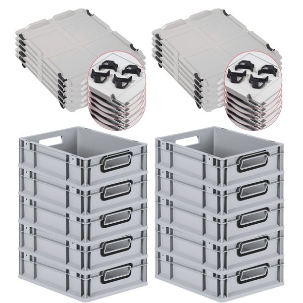 PROREGAL SparSet 10x Eurobox NextGen Color mit Auflagedeckel und Schiebeschnappverschlüsse, HxBxT 12x30x40cm, 11 Liter, Grau, Griffe schwarz offen, Eurobehälter, Transportbox, Transportbehälter, Stapelbehälter