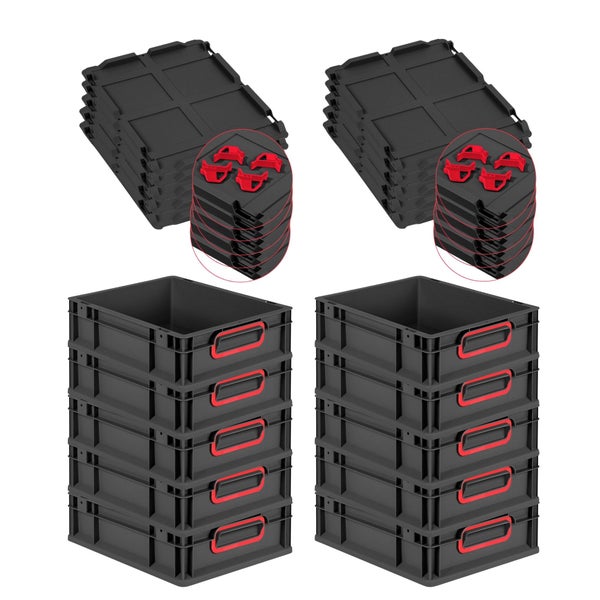PROREGAL SparSet 10x Eurobox NextGen Color mit Auflagedeckel und Schiebeschnappverschlüsse, HxBxT 12x30x40cm, 11 Liter, Schwarz, Griffe rot geschlossen, Eurobehälter, Transportbox, Transportbehälter, Stapelbehälter