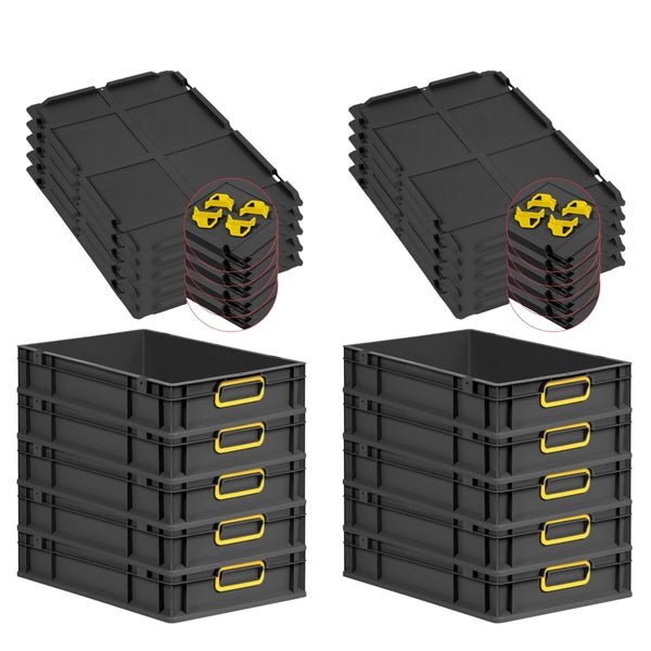 PROREGAL SparSet 10x Eurobox NextGen Color mit Auflagedeckel und Schiebeschnappverschlüsse, HxBxT 12x40x60cm, 23 Liter, Schwarz, Griffe gelb geschlossen, Eurobehälter, Transportbox, Transportbehälter, Stapelbehälter