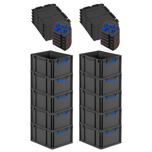 PROREGAL SparSet 10x Eurobox NextGen Color mit Auflagedeckel und Schiebeschnappverschlüsse, HxBxT 22x30x40cm, 20 Liter, Schwarz, Griffe blau geschlossen, Eurobehälter, Transportbox, Transportbehälter, Stapelbehälter
