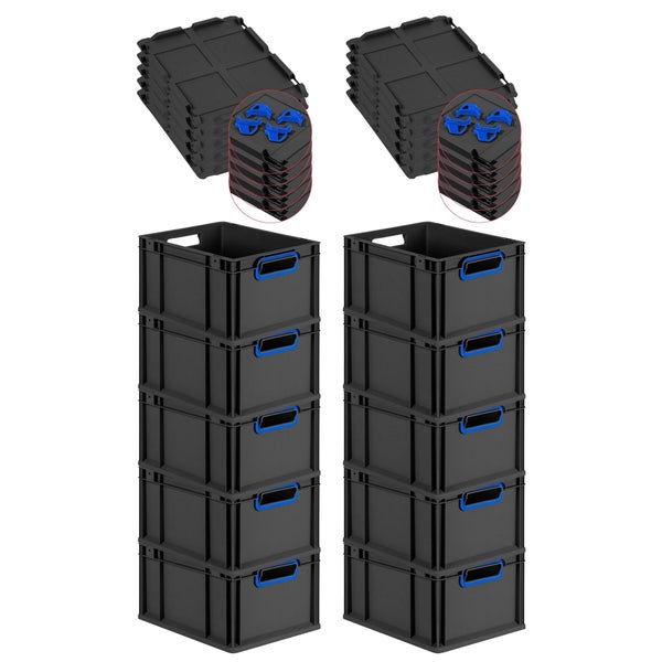 PROREGAL SparSet 10x Eurobox NextGen Color mit Auflagedeckel und Schiebeschnappverschlüsse, HxBxT 22x30x40cm, 20 Liter, Schwarz, Griffe blau offen, Eurobehälter, Transportbox, Transportbehälter, Stapelbehälter