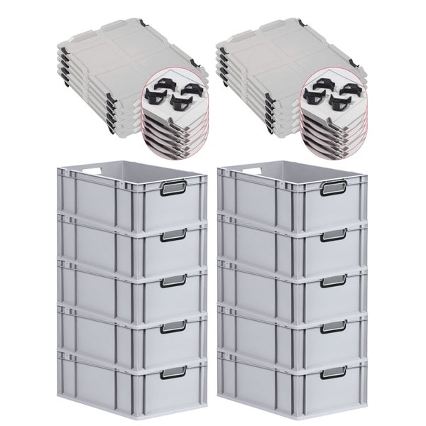 PROREGAL SparSet 10x Eurobox NextGen Color mit Auflagedeckel und Schiebeschnappverschlüsse, HxBxT 22x40x60cm, 44 Liter, Grau, Griffe schwarz offen, Verstärkter Boden, Eurobehälter, Transportbox, Transportbehälter, Stapelbehälter