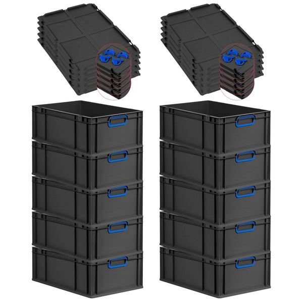 PROREGAL SparSet 10x Eurobox NextGen Color mit Auflagedeckel und Schiebeschnappverschlüsse, HxBxT 22x40x60cm, 44 Liter, Schwarz, Griffe blau geschlossen, Verstärkter Boden, Eurobehälter, Transportbox, Transportbehälter, Stapelbehälter