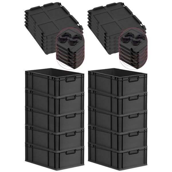 PROREGAL SparSet 10x Eurobox NextGen Color mit Auflagedeckel und Schiebeschnappverschlüsse, HxBxT 22x40x60cm, 44 Liter, Schwarz, Griffe schwarz geschlossen, Verstärkter Boden, Eurobehälter, Transportbox, Transportbehälter, Stapelbehälter