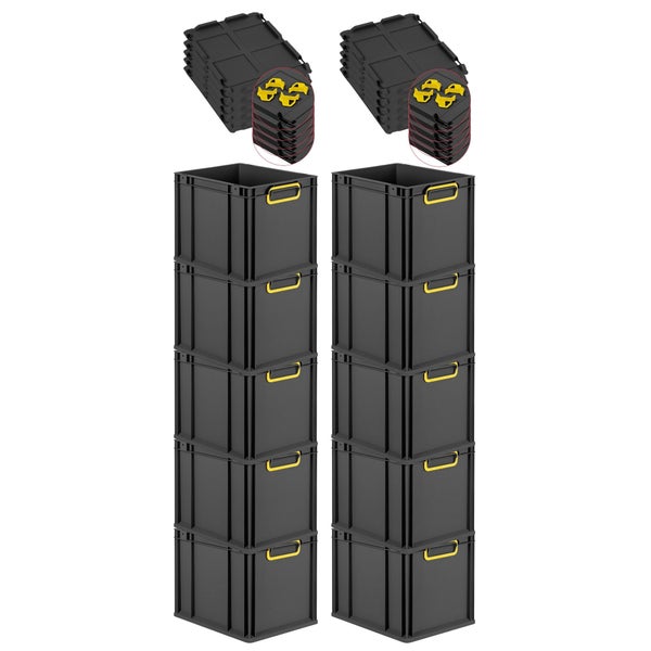 PROREGAL SparSet 10x Eurobox NextGen Color mit Auflagedeckel und Schiebeschnappverschlüsse, HxBxT 32x30x40cm, 30 Liter, Schwarz, Griffe gelb geschlossen, Eurobehälter, Transportbox, Transportbehälter, Stapelbehälter