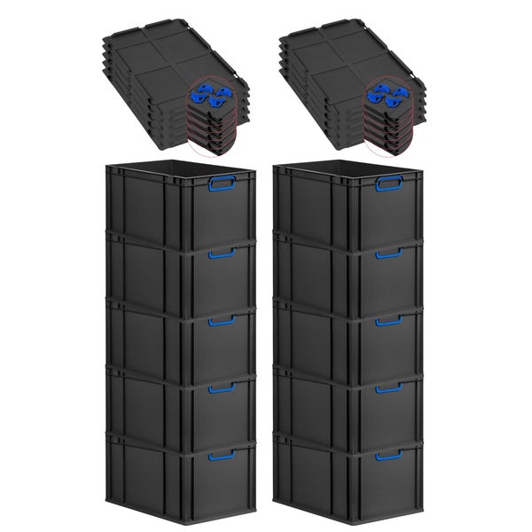 PROREGAL SparSet 10x Eurobox NextGen Color mit Auflagedeckel und Schiebeschnappverschlüsse, HxBxT 32x40x60cm, 65 Liter, Schwarz, Griffe blau geschlossen, Verstärkter Boden, Eurobehälter, Transportbox, Transportbehälter, Stapelbehälter