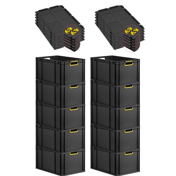 PROREGAL SparSet 10x Eurobox NextGen Color mit Auflagedeckel und Schiebeschnappverschlüsse, HxBxT 32x40x60cm, 65 Liter, Schwarz, Griffe gelb offen, Verstärkter Boden, Eurobehälter, Transportbox, Transportbehälter, Stapelbehälter