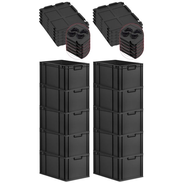 PROREGAL SparSet 10x Eurobox NextGen Color mit Auflagedeckel und Schiebeschnappverschlüsse, HxBxT 32x40x60cm, 65 Liter, Schwarz, Griffe schwarz geschlossen, Verstärkter Boden, Eurobehälter, Transportbox, Transportbehälter, Stapelbehälter