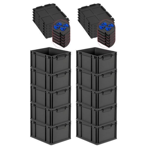 PROREGAL SparSet 10x Eurobox NextGen Grip mit Auflagedeckel inkl. 4 blauen Schiebeschnappverschlüssen, HxBxT 22x30x40cm, 20 Liter, Schwarz, Griffe geschlossen, Eurobehälter, Transportbox, Transportbehälter, Stapelbehälter