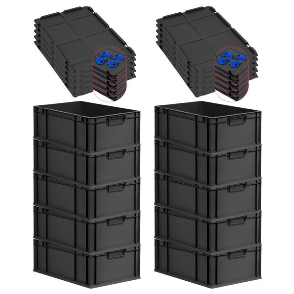 PROREGAL SparSet 10x Eurobox NextGen Grip mit Auflagedeckel inkl. 4 blauen Schiebeschnappverschlüssen, HxBxT 22x40x60cm, 44 Liter, Schwarz, Griffe geschlossen, Verstärkter Boden, Eurobehälter, Transportbox, Transportbehälter, Stapelbehälter